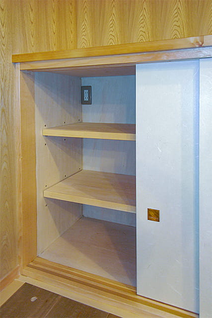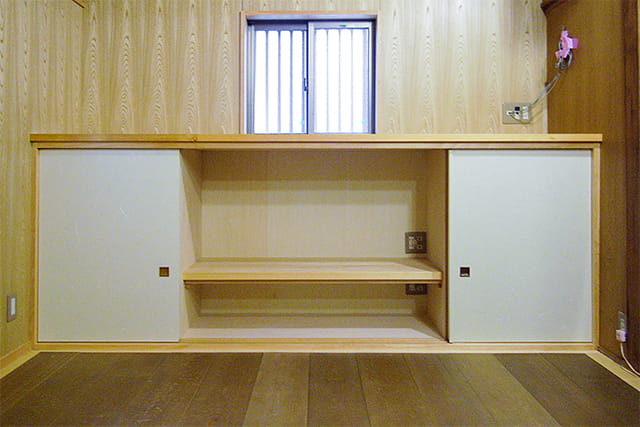 窓際には使いやすい収納を設けました。しまう用具に合わせたオリジナルの収納です。 テレビなどの機器類も置かれる予定とのことで、内部にコンセントも設けました。
