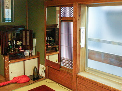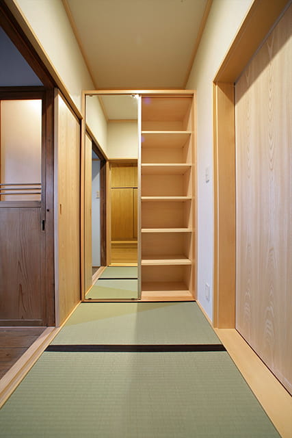 稽古場から続く小部屋は、日本舞踊の生徒さんたちが使う更衣室です。 リフォーム前は水屋でしたが、床を畳に替えて、着替えに使えるスペースになりました。