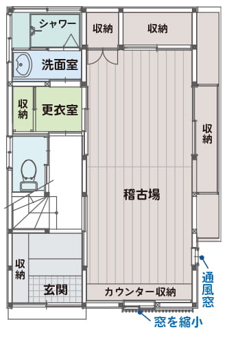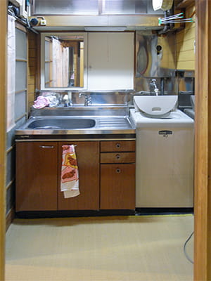 稽古場として使いやすいよう、キッチンを撤去して洗面台を設置し、小さめの洗面室にしました。
