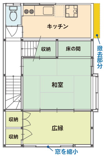 リフォーム前は広縁の幅いっぱいに窓がありましたが、窓を3/4ほどに縮小しました。 これで壁量が増え、耐震性もアップします。
