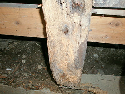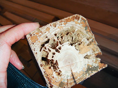 水まわりはシロアリ被害も深刻でした。 外から見ると何でもないような柱も、内部はシロアリに食われて軽石のようになっています。 根本がシロアリ被害にたられて、ぶら下がっている状態の柱もありました。