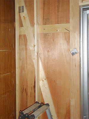 耐力壁を増やして、不足している壁量を補完します。内部から筋交いや耐震補強金具を使って、壁を補強しました。