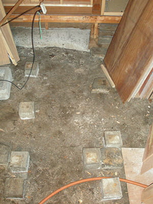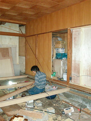 K様は特に水まわり部分の劣化を心配されていました。 解体前はそれほど傷んでいないように見えましたが、ご心配の通り、床下はかなりの傷みが見られました。 傷んだ箇所の木材を交換して補強する必要があります。