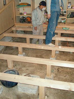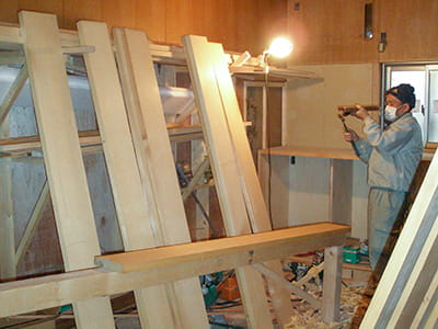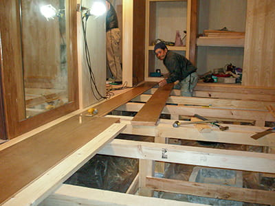 次は内装を整えていく工事です。 K様のご希望どおり、伊勢神宮の御用材である木曽ヒノキを床板として使用します。