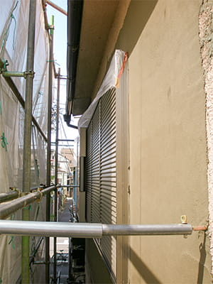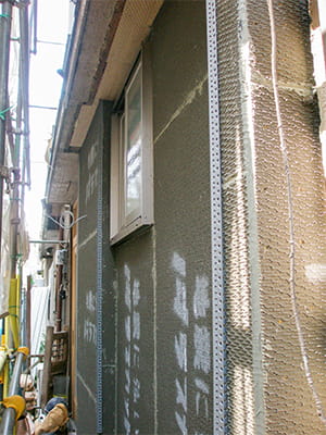 外部からの補強も行います。外壁の下地材として、地震や火災に強いラスカットパネルを張りました。 建物の強度と耐久性を高める素材です。