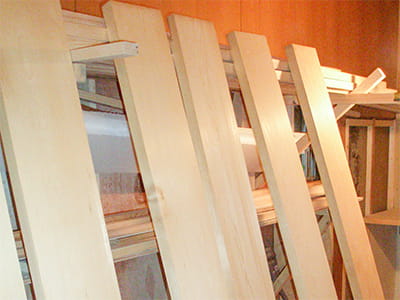 リフォーム現場へ、立派な木曽ヒノキがやってきました! 通常の床材とは厚みも違い、日本舞踊の舞台にふさわしい材料です。