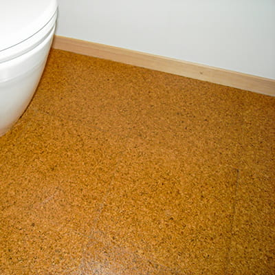 トイレと洗面室の床は、水に強いコルクタイルを採用しました。 ソフトな肌触りで、裸足で歩いてもヒヤッとしない優れもの。 エコリフォームおすすめの自然素材です。