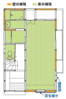 図のオレンジ部分が内側から壁を補強する箇所、グリーン部分が床を補強する箇所です。
