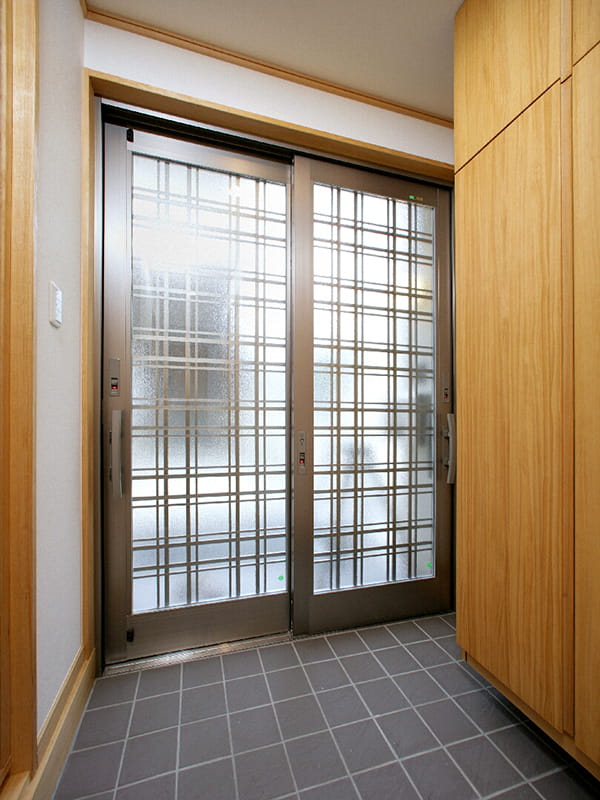 玄関引戸は、ショールームで実物をご確認いただいた、防犯性の高いものに。 鍵はダブルロックで、ガラスを破っても外から開けられないセキュリティサムターン仕様です。 玄関にたっぷり光を取り込めるデザインに、ご家族全員、大満足だそうです。