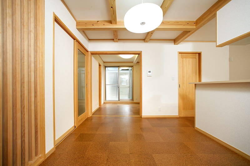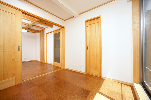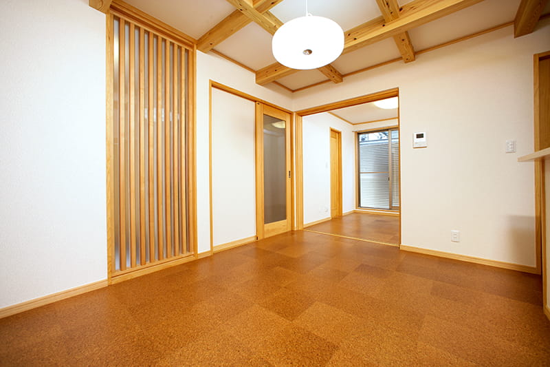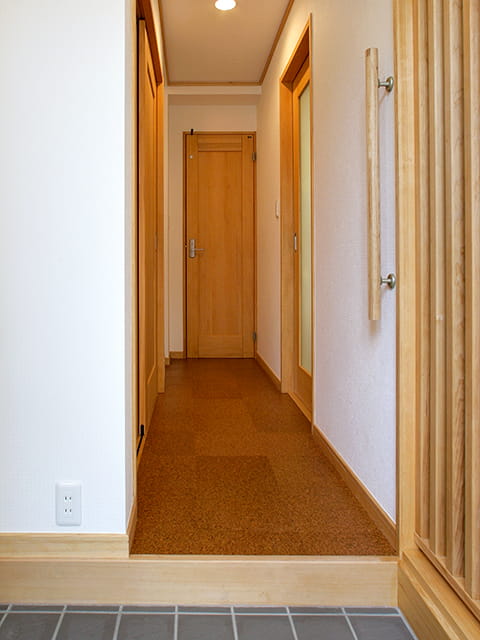 床には、水まわりがあることと、将来的に介護をする可能性を考慮して、水に強いコルクタイルを採用しました。 夏はサラッと、冬はほんのり暖かい肌触りで、裸足で歩くと気持ちが良い素材です。