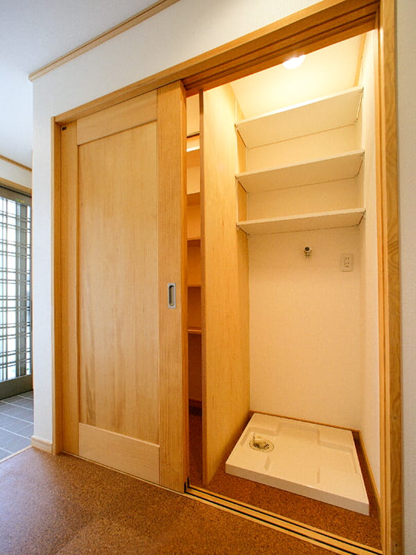 クローゼットの反対側は、洗濯機置場になっています。 来客時などは隠せるように、引違いの扉を付けました。