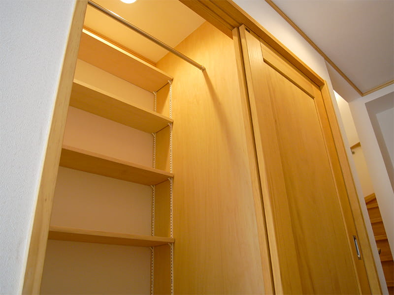 玄関を上がってすぐの廊下に、大きなクローゼットを設けました。 Y様は花粉症とのことですが、ここに上着をかければ、室内に花粉を持ち込む心配がありません。