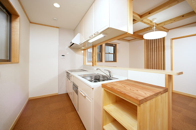 「キッチンのこまごました物が、リビングから見えないようにしたい」というご要望を受けて、壁を背にした対面型のキッチンスペースをご提案しました。 リビングからほどよく独立したスタイルなので、キッチンの中は隠しつつ、お料理をしながらご家族との会話を楽しめます。