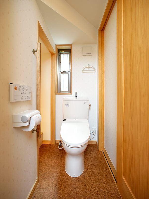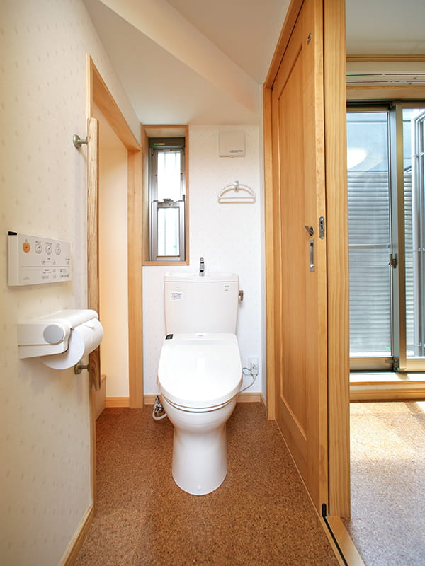 トイレは、洋室側と廊下側から出入りできるようになっています。 洋室側の扉は、開け閉めが楽な引戸を採用しました。
