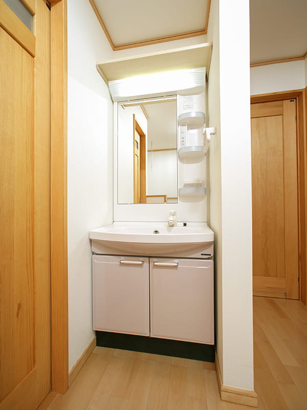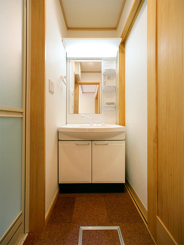 洗面室から浴室へとつながる水まわりは、洋室とキッチンの両方から入れる間取りです。 将来、自宅で介護をする必要が出てきた際も、使いやすいように設計されています。