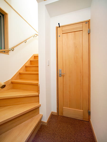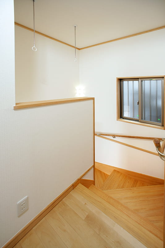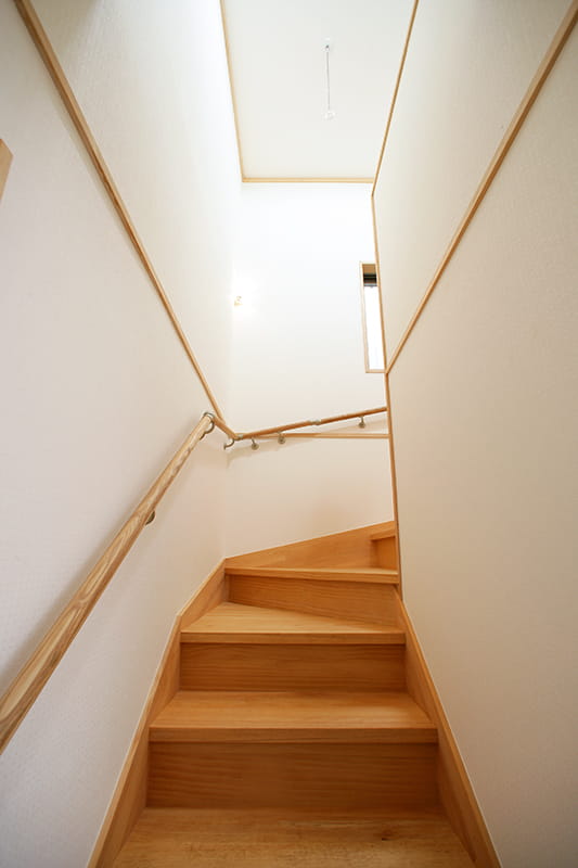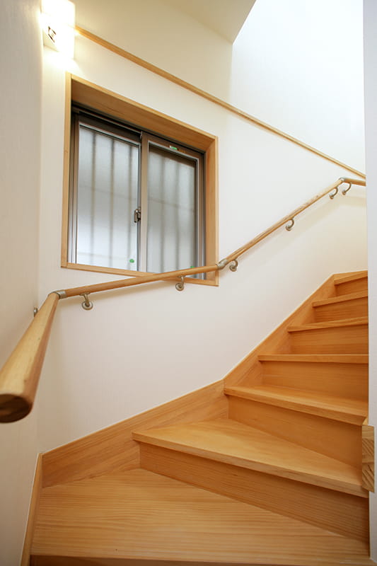 階段には無垢の集成材を使い、手すりにも無垢材を使っています。 手触りもほんのり暖かく、足にも手にもやさしい造りの階段です。