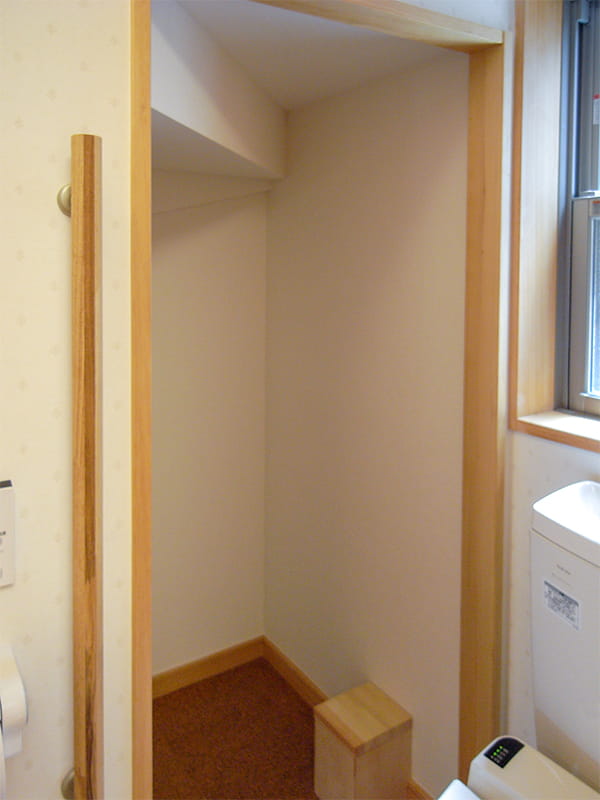 また、トイレの中には階段下スペースを利用した収納を設けました。 手すりも付いて、安全に使えるトイレです。