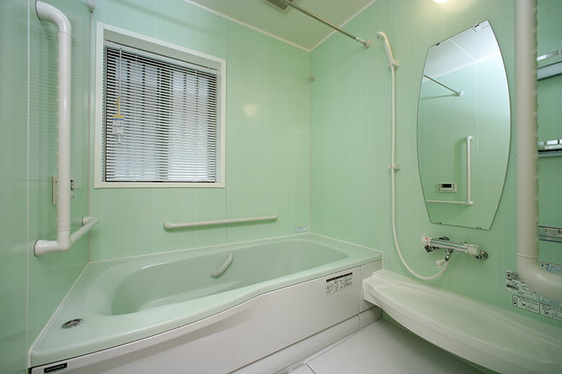 お風呂は広さをゆったりと取り、足を伸ばして入れる大きさに。 さわやかなライムグリーンのお風呂で、一日の疲れが癒やされそうです。 Y様のリクエストで、窓はできる限り大きなものにしました。