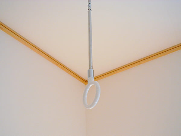 奥様のアイデアで、階段上のスペースも有効活用して、ホスクリーンを取り付けました。 ホスクリーンは室内に洗濯物を干すのに便利な器具で、輪の部分にハンガーをかけたり、2つの輪に物干し竿を通したりして使います。