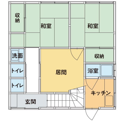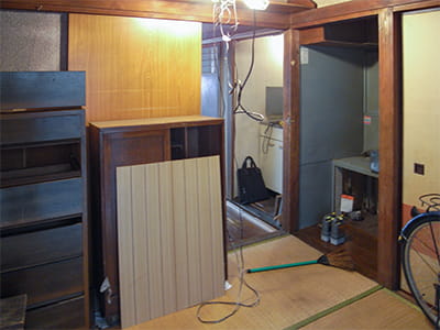 リフォーム前のY様邸は各部屋が細かく区切られた間取りでした。2階のお部屋を下宿として貸されていたこともあるそうです。 経年に加えて、誰も住んでいない時期があり、雨水の浸入もあったことから、各所に傷みが見られました。