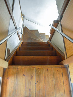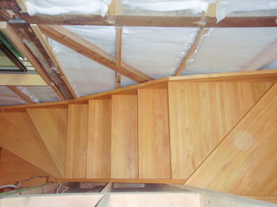 昔ながらの家に多い急勾配の階段でしたが、傾斜がゆるやかなものに架け替えました。 手すりもついて、安全に上り下りできるようになっています。