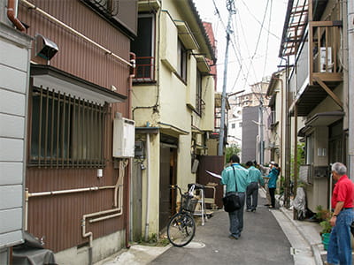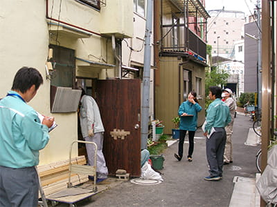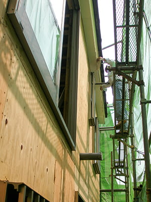 Y様邸は都心の住宅密集地にあって前の道路の幅員が狭いため、いつも以上に安全に気を配りながら工事を進めます。 また、経年による傷みもあり、難工事となることが予想されました。