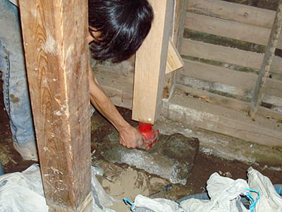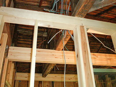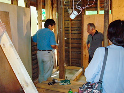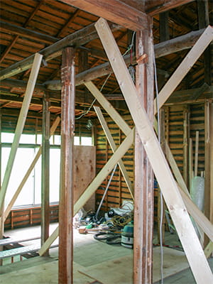 地震に強い家にするため、適切な耐震補強を施し、建物の強度をあげます。 60年の年月を経た家は、相応の傷みが見られます。 すべての箇所をきちんと調査して、使える部分は残して補強し、劣化した部分は造り直します。