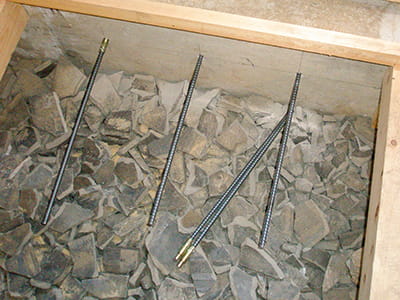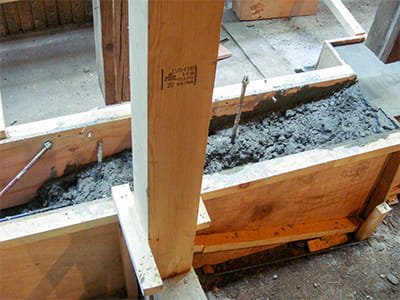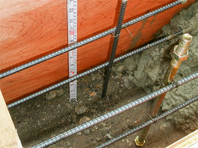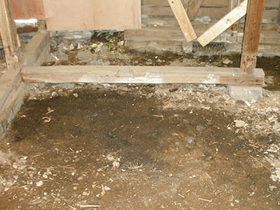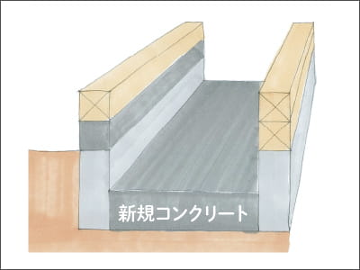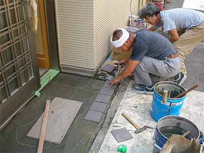 Y様邸では、家を支えるはずの基礎が、地盤沈下によって埋没した状態になっていました。 このため、道路から玄関へ雨水が入ってくるトラブルが何度かあったそうです。 浸水を防ぐため、基礎部分の補強を行い、高さも少し上げることにしました。