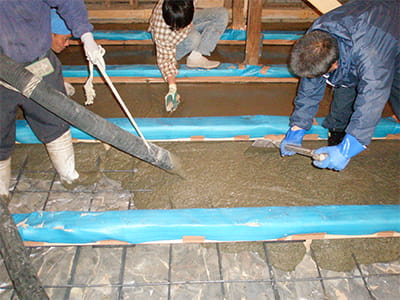 まず、経年と地盤沈下によって住宅の床が下がり、地盤面と1階の床が同じくらいのレベルになっていました。 さらに、前面道路は軽自動車がギリギリ通れるくらいの幅員のため、資材の搬入、搬出に苦労しました。 ご近隣の皆様のお心遣いもあり、何とか無事に工事を終えることができて良かったです。