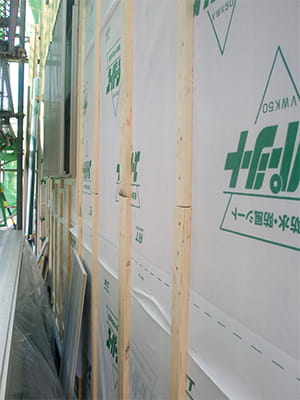 外部に面した壁と、床、天井に断熱材を施工して、気密性・断熱性を上げます。 断熱材は、身体と環境にやさしいものを採用しています。 壁にはペットボトルをリサイクルして作られるパーフェクトバリアを採用しました。