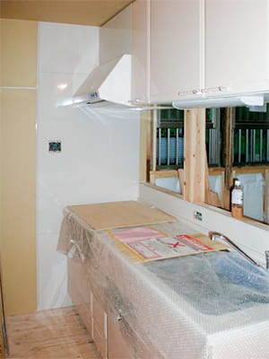 キッチンなどの設備を取り付け、内部の仕上げ工事に入りました。 リフォーム完成へと近づいていくのが、目に見えてわかります。 現場にいらしたY様も、とってもうれしそうでした。