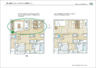 介護はまだまだ先の話だと思いますが、今のうちに将来に備えておきたいというY様のご夫妻のお気持ちに添えるようなリフォームプランを作成しました。 特に1階に関しては、これから安心してご生活できるよう、細かいご提案をさせていただきました。