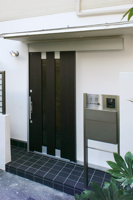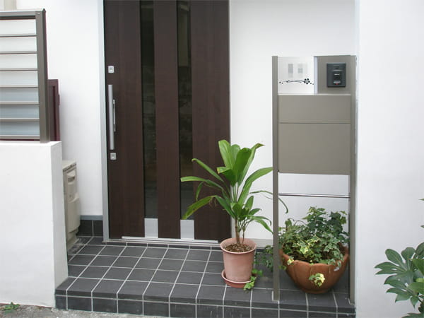 シックな玄関タイルにステンレスの郵便受けで、スタイリッシュな玄関に変身しました。 漆喰の白い壁との相性もピッタリです。