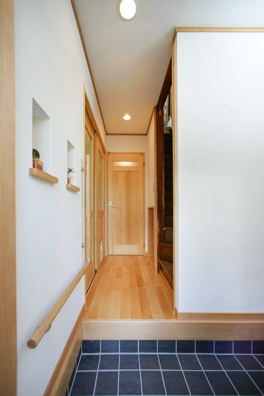 引き戸を開けると、リフォーム前に比べて、明るくなった玄関です。 ダークグレーの玄関タイルに無垢材の組み合わせが落ち着いた雰囲気を醸し出しています。