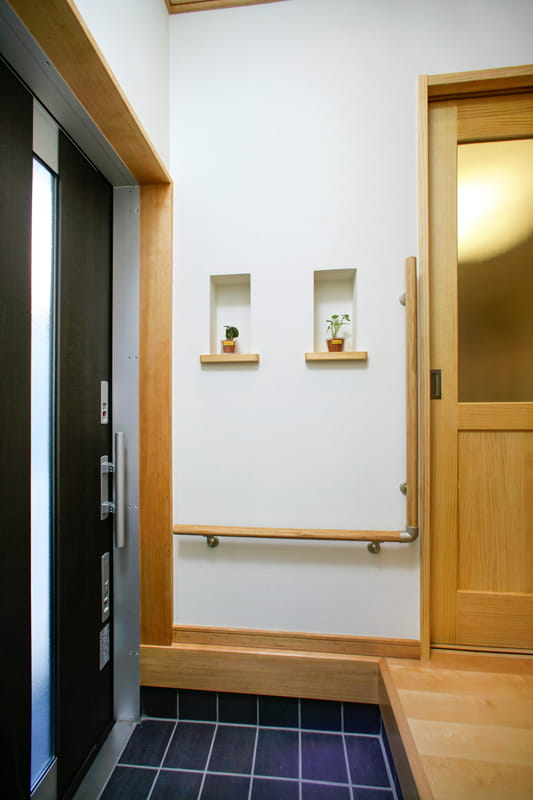 玄関框を上り下りしたり、靴を履いたりする時のために、L字型の手すりを設置しました。 ちょうどいい高さの手すりで、ご高齢になってからも安心です。