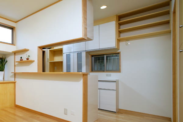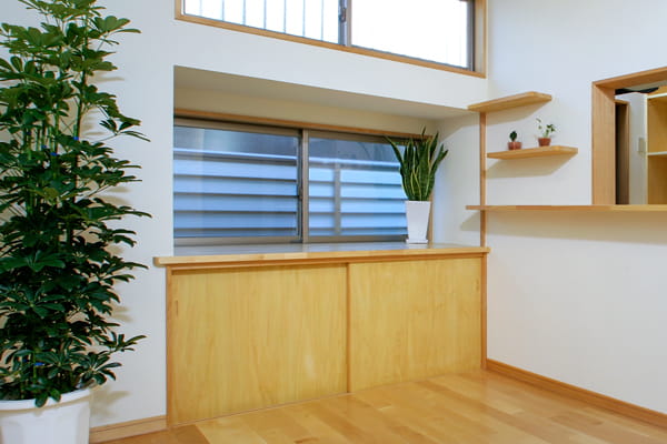 S様邸では随所に使いやすい収納を設けることで、スッキリお暮らしいただけるだけでなく、スムーズな動線も確保できるようにしました。