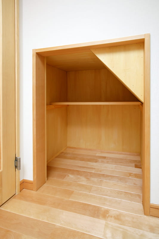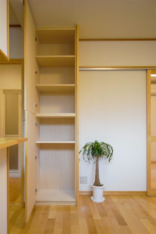リフォーム前は収納が足りず、S様は市販の収納ボックスなどをお使いでしたが、室内がスッキリ片付かないことにお悩みでした。 今回のリフォームで、デッドスペースになっていた箇所も有効活用して、収納スペースをかなり増やしました。