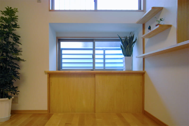 出窓の外のブロック塀は、上半分を半透明のフェンスにしました。 S様邸は都心の住宅密集地にあるため、窓の外はすぐ公道ですが、フェンスが目隠しになって歩行者の目が気になりません。