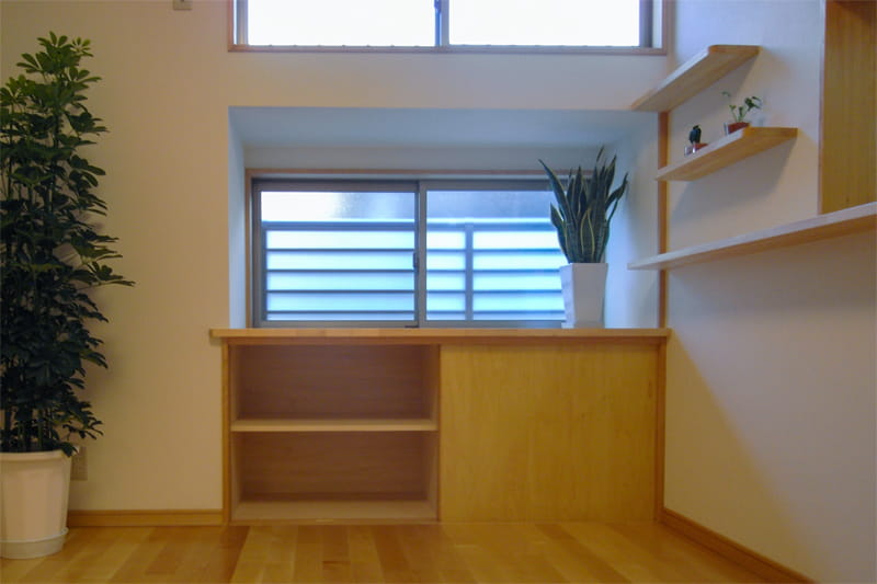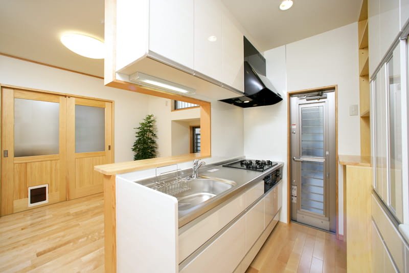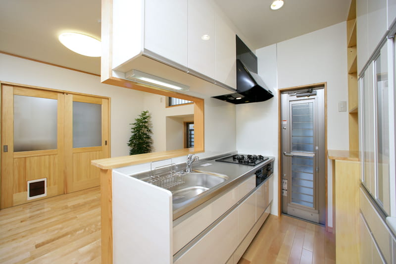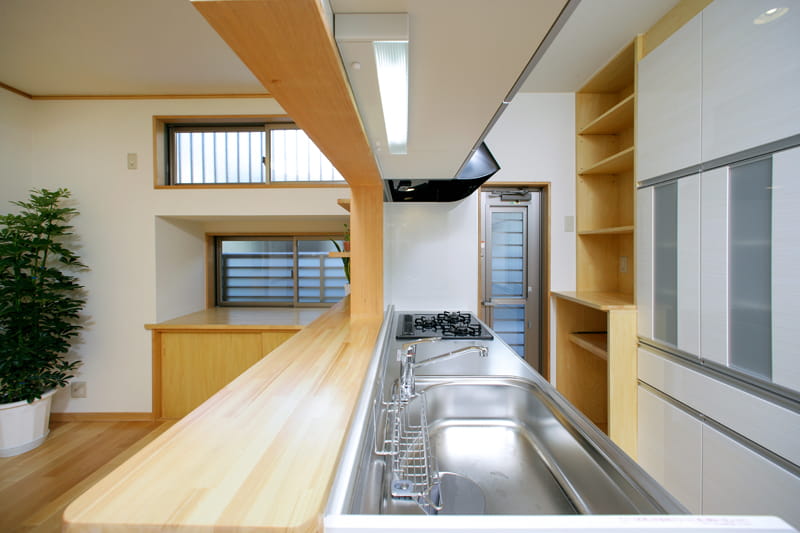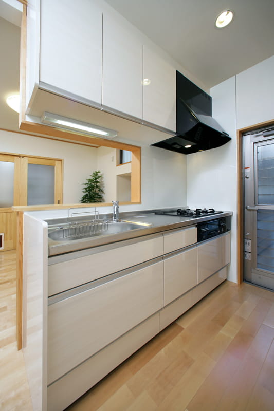 S様邸では、耐震性を高めるため、キッチンの前面に耐力壁を設けたため、キッチンスペースが少し狭くなっていました。 そこで、キッチンの奥行きが狭いサンウェーブ(現LIXIL)「ピット」を採用しました。