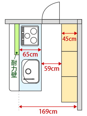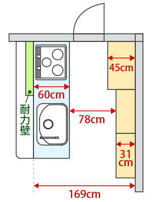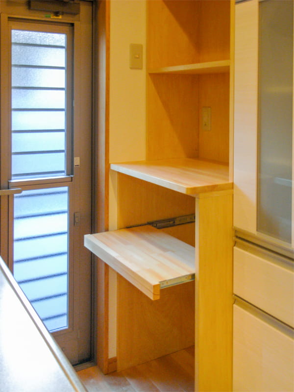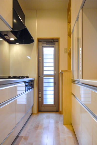 一般的なシステムキッチンは、キッチンの奥行きが65cm、背面収納の奥行きが45cmですが、S様邸ではキッチンが60cm、背面収納が31cmのものを選び、S様のお立ちになるスペースを広く取りました。