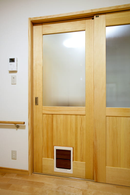 これまでは、猫ちゃんの出入りのために引き戸を少し開けておいたのですが、今回のリフォームでキャットドアを設置することになりました。建具職人さんに依頼して、特注で加工したものです。