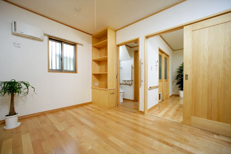 S様のご要望の一つが、ご両親が負担なく過ごせるお住まいにすることでした。 そこで、1階にあるご両親のお部屋は、安全で快適に過ごせるように力を入れて計画しました。