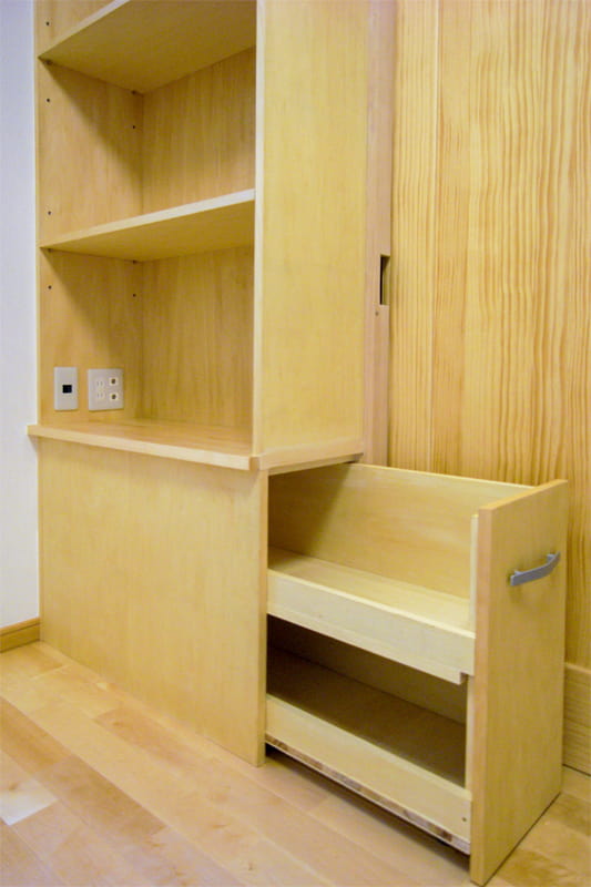 トイレへの扉の隣にあるのは、お母様専用の収納棚です。便利な引き出し収納付きで、小さなテレビなどを置けるようにコンセントを設けました。