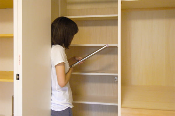 押入れは大きなクローゼットに変わりました。 しまう物に合わせて、奥を収納棚、手前をハンガーパイプにして、奥の物も取り出しやすいように計画しています。 ハンガーパイプは取り外すこともできますよ。