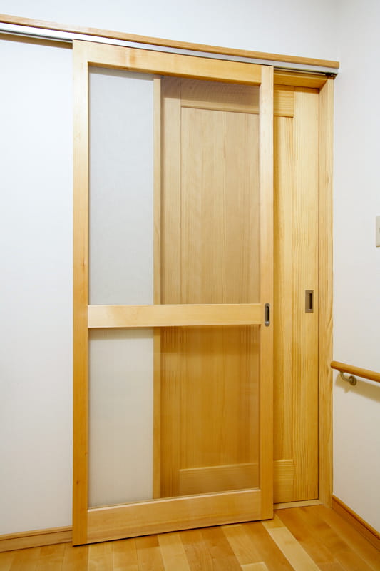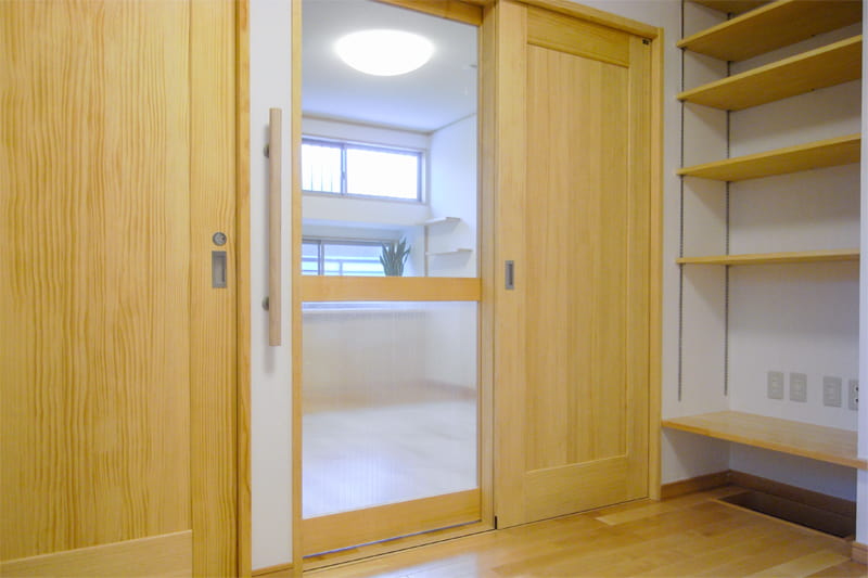 廊下からリビングへの扉は、ウッドワン製の無垢の引き戸を採用しました。