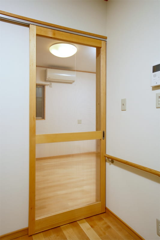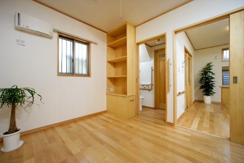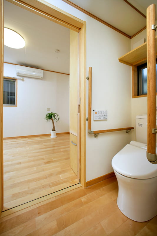 今回のリフォームで、トイレの扉を廊下側とご両親のお部屋側の2方向に設置して、ご両親のお部屋から直接トイレに入れるようになりました。 扉が2つあるとトイレの介助もしやすいので、ご高齢になっても安心ですね。