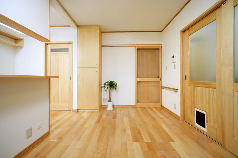 エコリフォームでは、身体にやさしく心地よい自然素材をおすすめしています。 S様邸のリフォームでも、無垢フローリングや無垢の建具、和紙の壁紙などをご提案したところ、S様もとても気に入ってくださいました。 無垢フローリングや無垢の建具は1階全体に、猫ちゃんが引っ掻いてしまいそうな和紙壁紙はご両親のお部屋に採用されました。