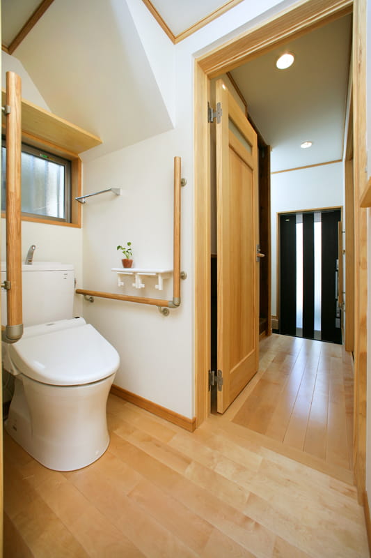 トイレの中には、左右にL字型の手すりを設置しました。 入口の外側にも手すりを設置して、引き戸を開けやすいように配慮しました。