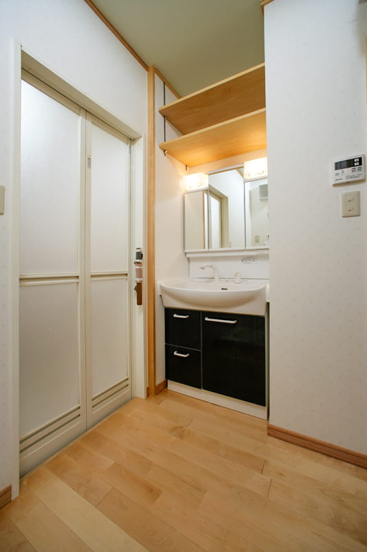 コンパクトだった洗面室は少し広くなり、洗面台の位置も変わりました。 洗面台の上には棚を造作して、洗剤などのストックをしまうのに便利に使えます。