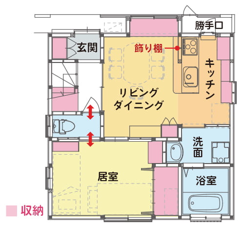 ビフォーアフターの図面を比較すると、収納がかなり増えているのがおわかりいただけると思います。 ただ収納の数を増やすのではなく、「どの場所にどんな収納が欲しいか」をS様に具体的にお話いただき、最適な箇所に収納を計画しているのです。収納する物までイメージすることで、スッキリ片付く収納を実現できて、動線も良くなります。